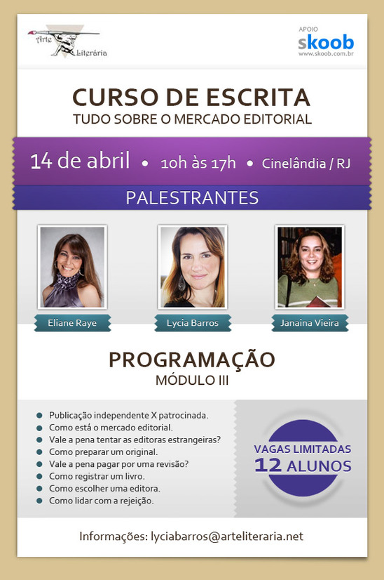 Lycia, autora de livros como A Bandeja — Qual Pecado Te Seduz, A Garota do Outro Lado da Rua e, o mais recente, Uma Herança de Amor, estará oferecendo neste mês, no Rio de Janeiro, mais um módulo de seu curso de escrita.