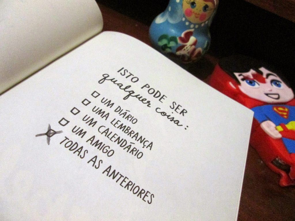 “1 página de cada vez” dá espaço para diferentes “eus”. A única coisa pedida em troca é aceitação sincera da proposta que ele traz. São mais de trezentas páginas com atividades que funcionam como bobagem, espelho, amigo, conselheiro. É um livro interativo, de autoajuda, poesia, biográfico, ficcional… Tudo ao mesmo tempo!